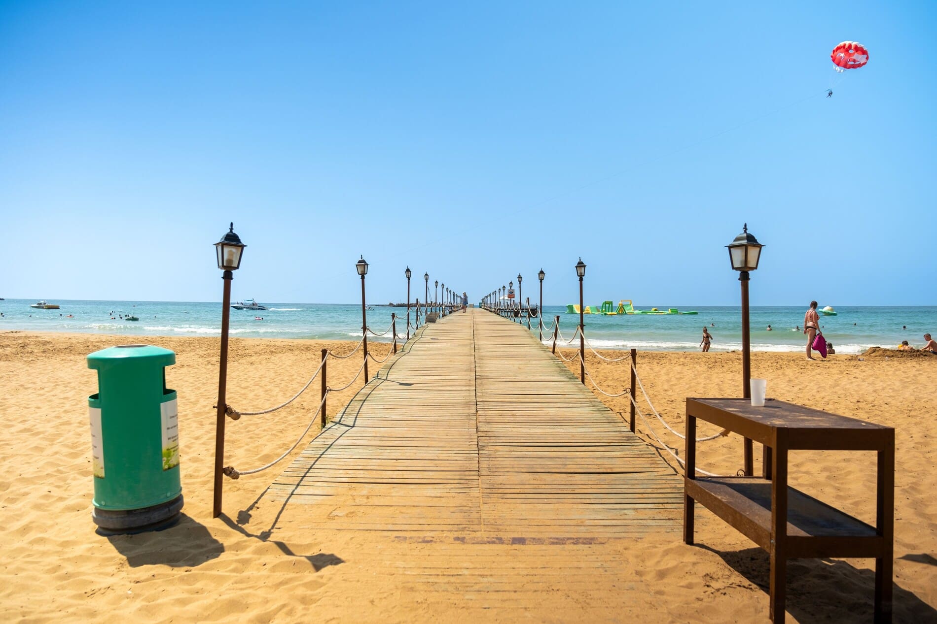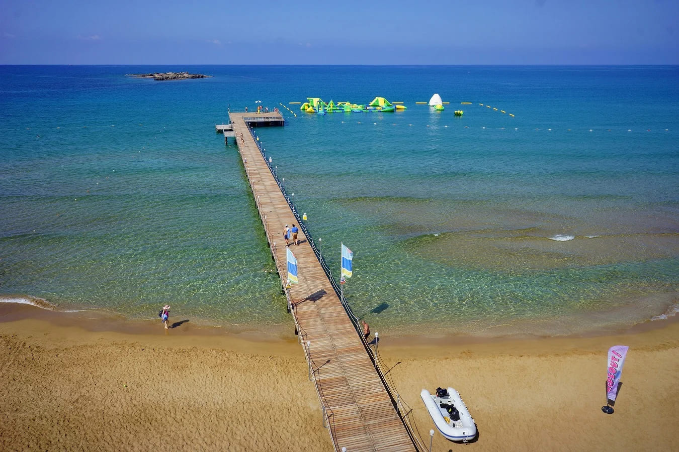 Собствен пясъчен плаж с кей. Безплатно ползване на чадъри и шезлонги на плажа и при басейните
