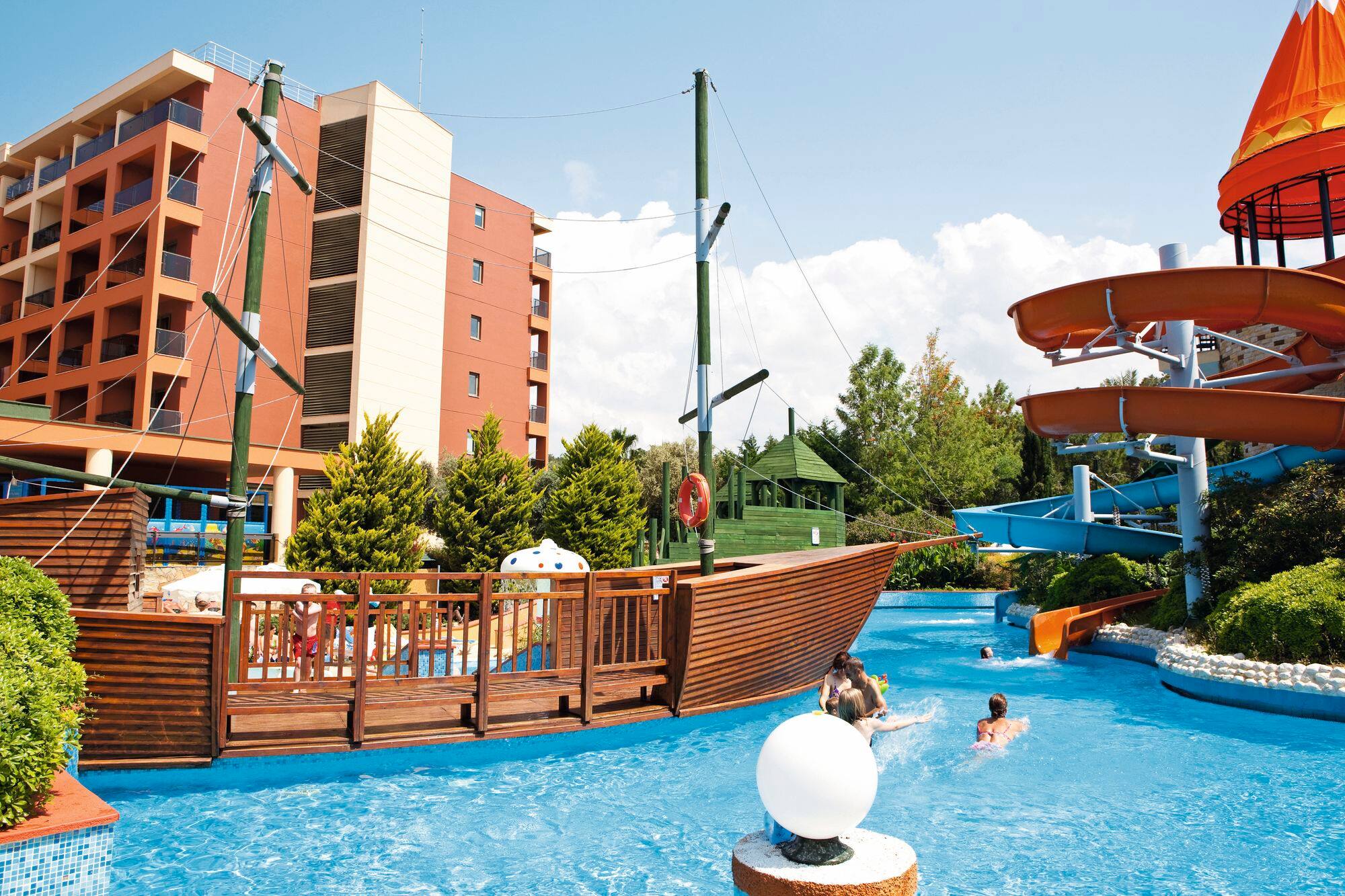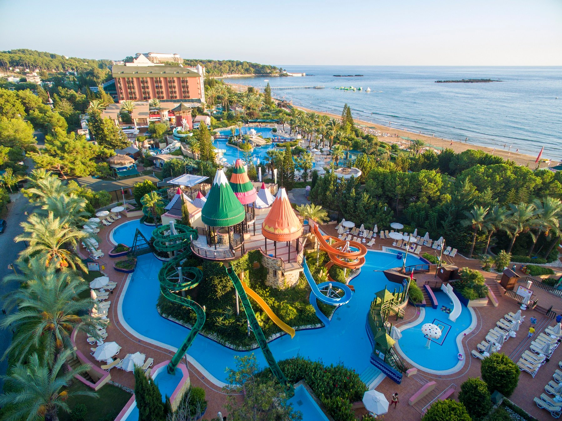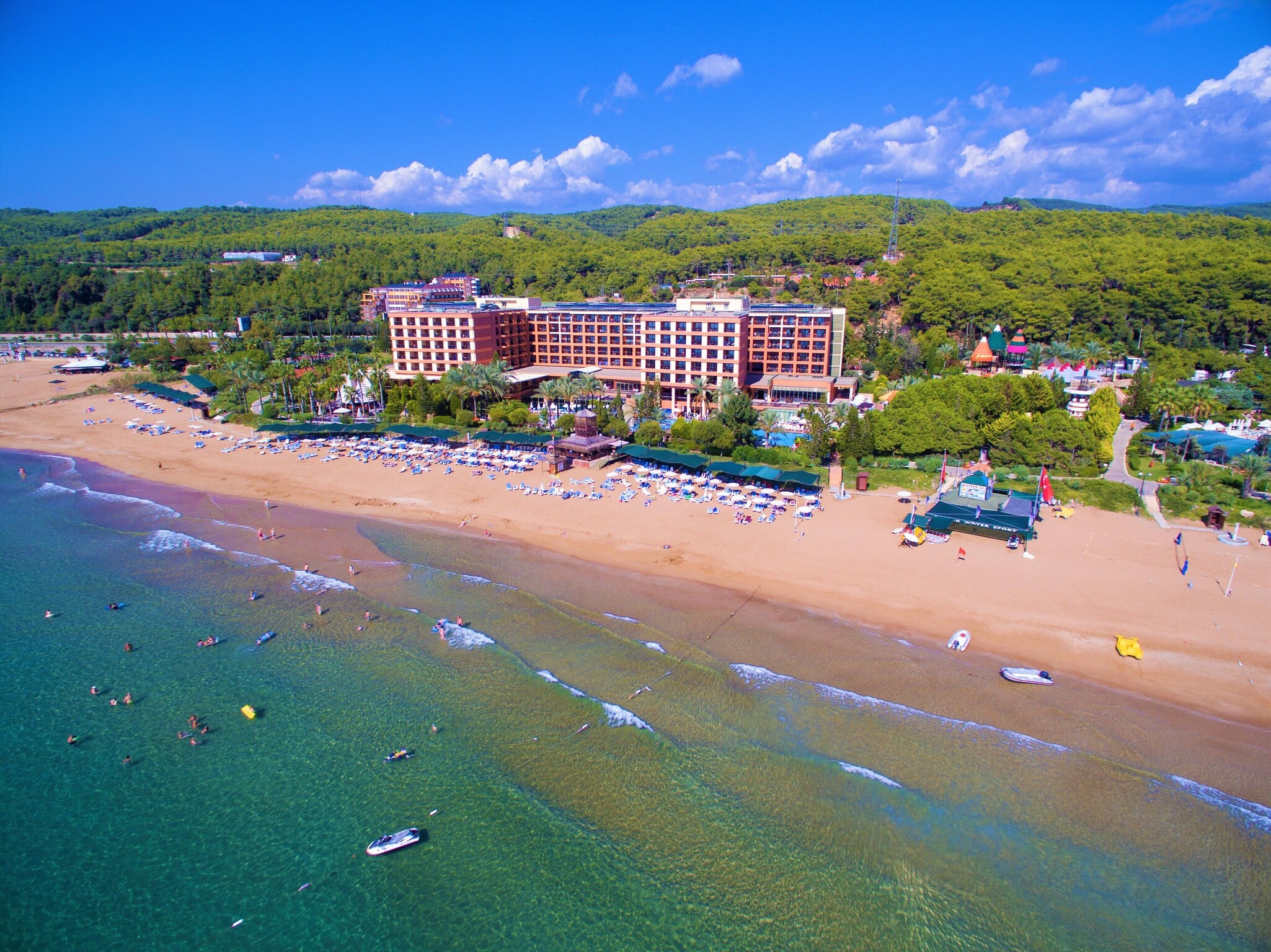 Хотелът разполага с плаж със Син флаг, два открити басейна и водни пързалки, които се предлагат като алтернатива на морето. Има много забавления за малките гости на хотела, така че семейства с деца да могат да се насладят максимално на почивката си. Децата има на разположение басейн с пързалки, където да събират незабравими спомени. За възрастните се организират дневни активности, игри и вечерни представления. С водни спортове като банан, джет ски, сърф и катамаран (срещу заплащане) можете да изживеете моменти, пълни със забавление и адреналин в уникалното синьо море на Анталия. В основния ресторант на хотела Ви очакват изискани вкусове от световната кухня. Ресторантът предлага тематични вечери, готвене на живо и специално обособен кът за деца. За максиимална релаксация и отмора можете да посетите Спа центъра и да използвате турска баня, сауна и масажни услуги (срещу заплащане).