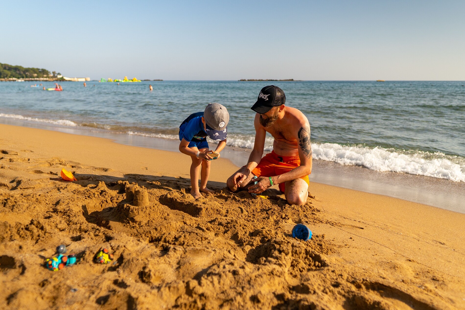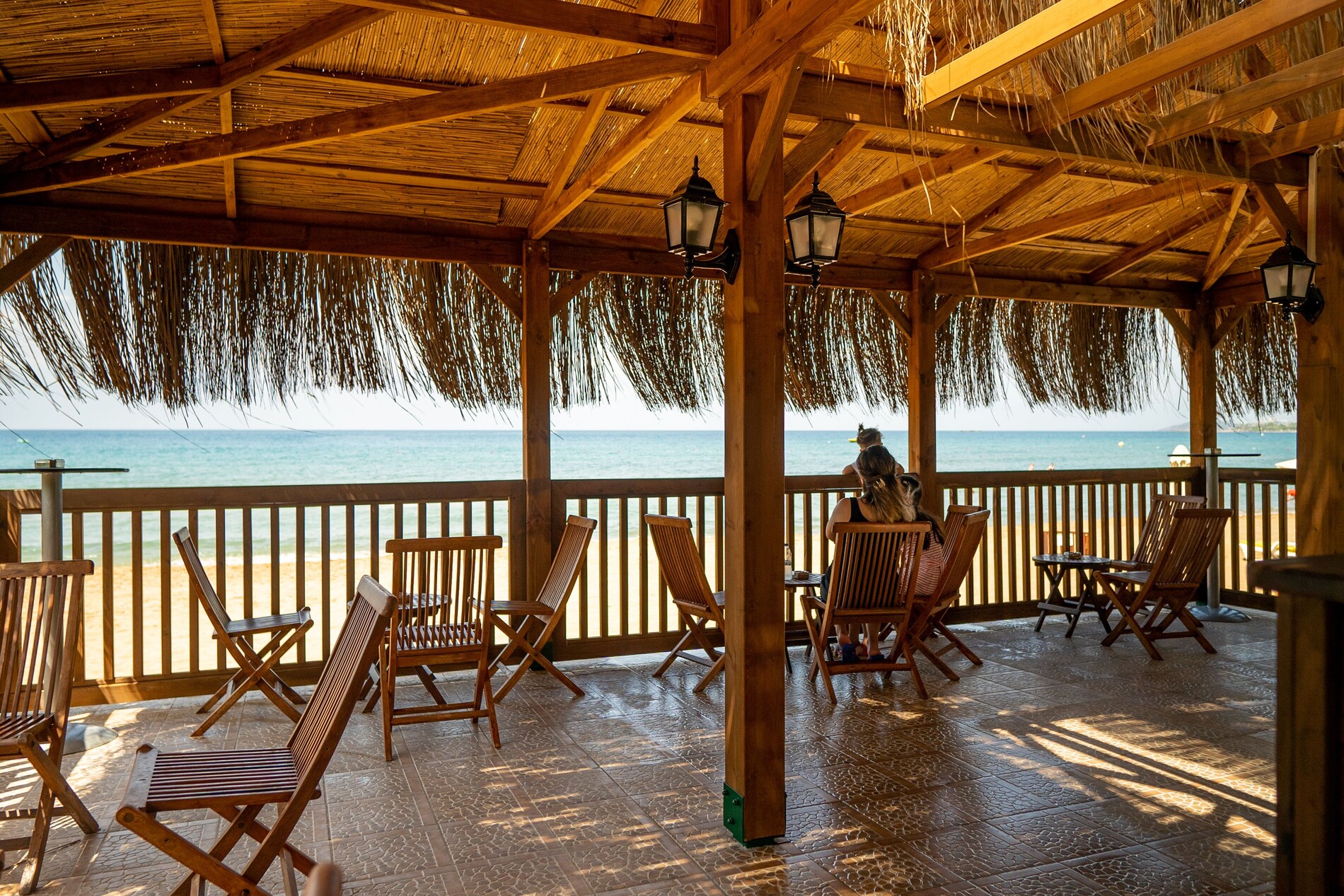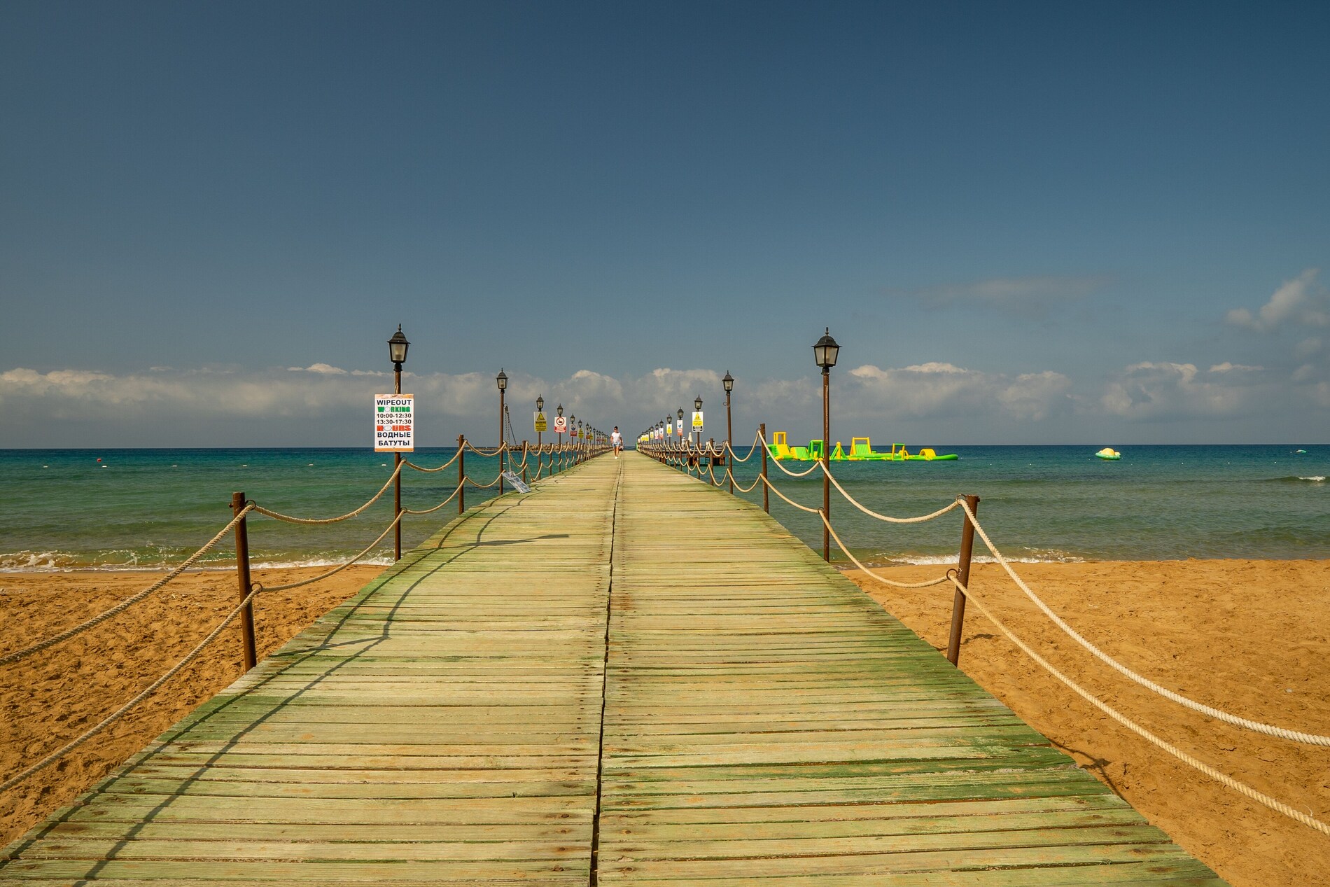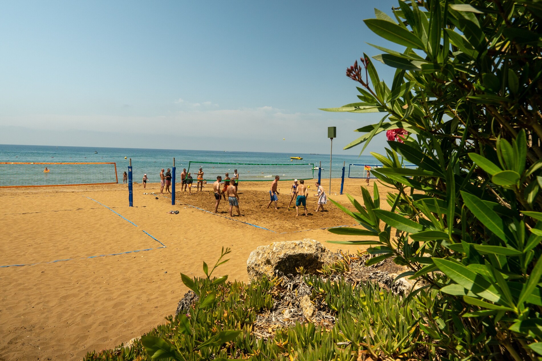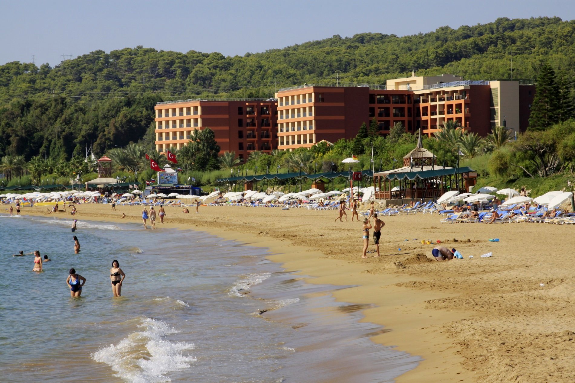 Собствен, пясъчен, удостоен със сертификат "Син флаг" за чистота. На басейна и на плажа има чадъри, шезлонги, матраци – безплатно. Плажни хавлии - безплатно.