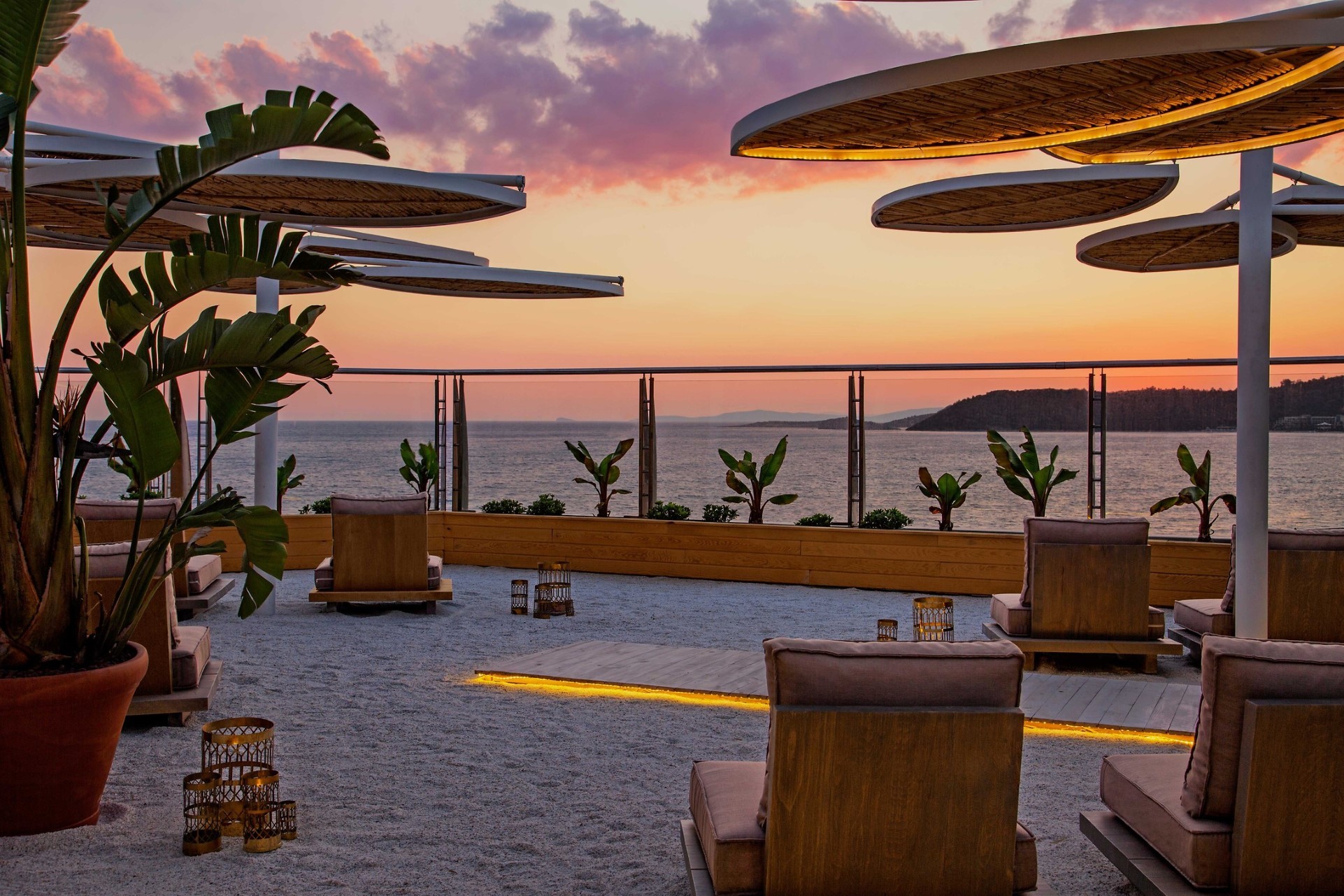 * Хотел, описан като разположен на първа линия на брега, е разделен от плажната ивица с алея или улица.