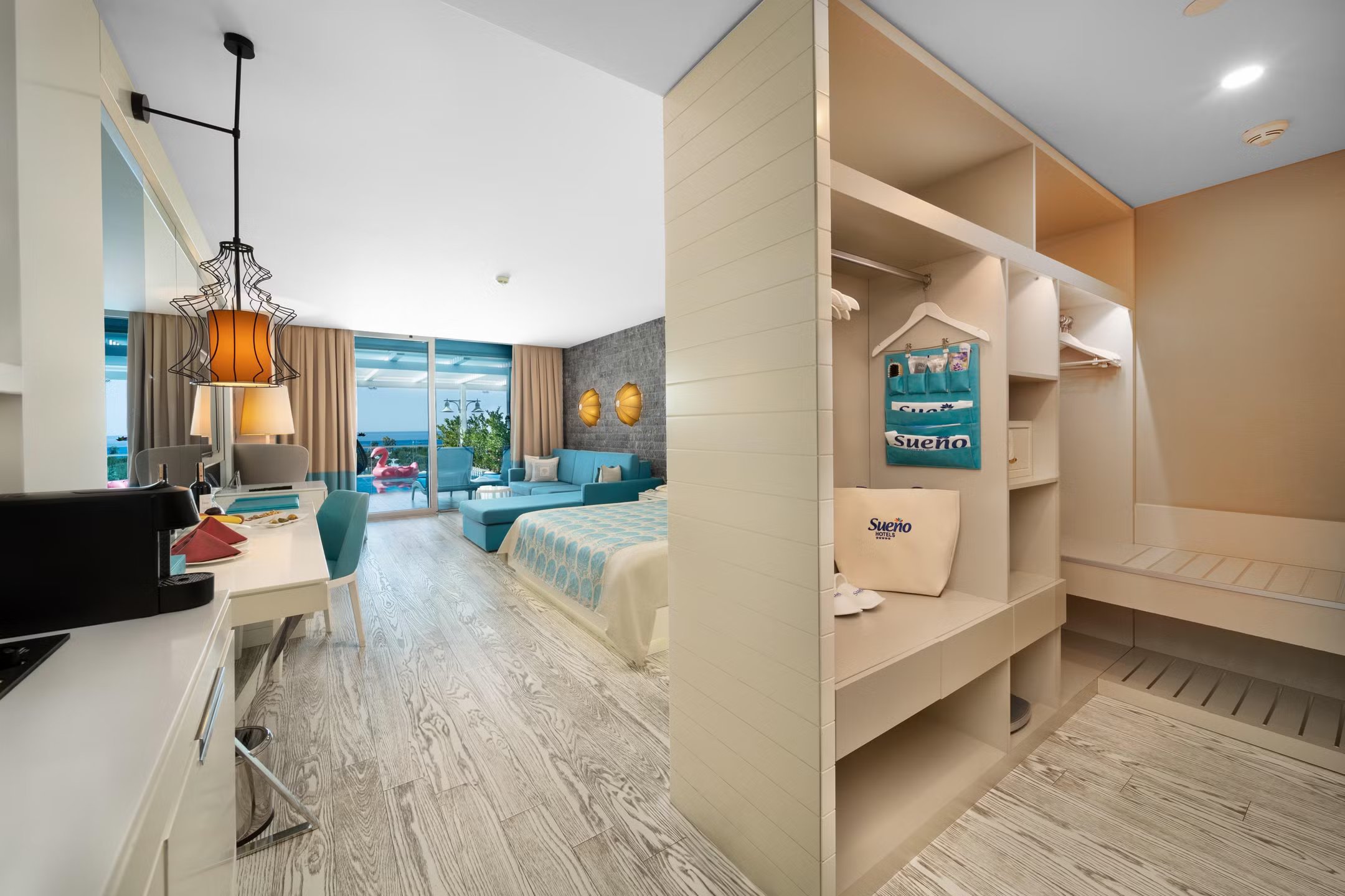 * Suite Room Sea View (70 кв.м) - разполагат със спално помещение и хол. Спалното помещение разполага с 1 двойно легло и разтегателен фотьойл, а хола с голям разтегателен диван. Максимално настаняване 2 възрастни с деца, 3 възрастни с 2 деца, 4 възрастни с 1 дете или 4 възрастни.